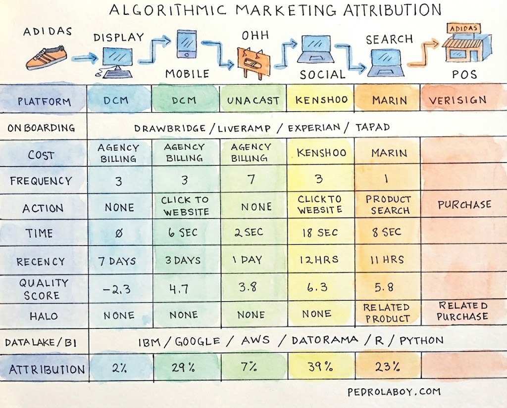 Algorithmic or Probabilistic Attribution uses statistics and machine learning to determine the probability of conversion across marketing touchpoints. In other words, how much of a conversion should be attributed to each channel. In order to keep things simple, I randomly chose a few variables—out of dozens or more—that could go into our model. Let’s go through the rows one at a time.
