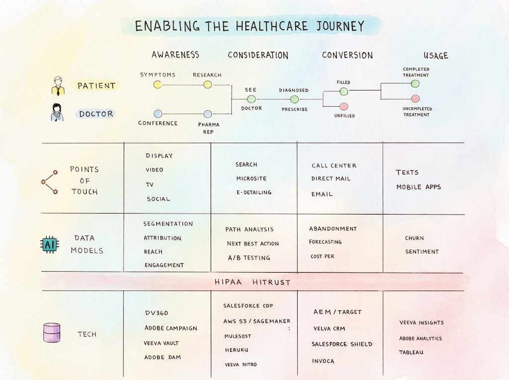 From a marketing perspective, enabling the healthcare or prescription journey is a complex landscape of intertwined stakeholders, regulations, technologies and touchpoints. The interests and needs of healthcare providers (HCPs) and patients will converge and diverge at different points. Having the right technology infrastructure and targeting strategies is key to the successful completion of this journey.