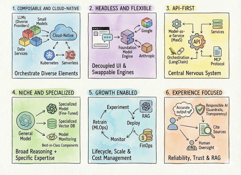 A growth-enabled architecture has evolved from a high-level goal to a set of concrete technical requirements. First, it must support the complete AI lifecycle (MLOps/LLMOps), from experimentation to deployment, continuous monitoring for drift, and systematic retraining. Second, it must be engineered to scale enterprise-specific patterns like Retrieval-Augmented Generation (RAG). Finally, growth enablement now includes rigorous cost management (FinOps for AI), ensuring that as usage scales, the economic viability of the AI solutions is maintained.